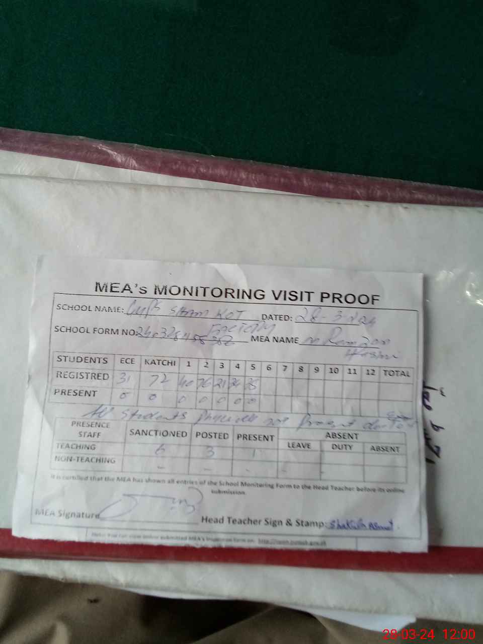 | Attendance Register | Head Teacher | MEA with School | Visit Proof |