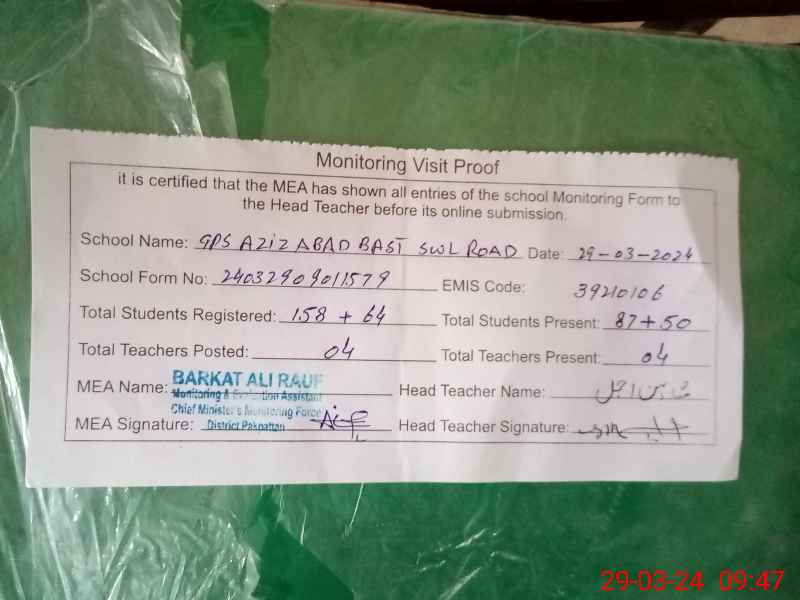| EMIS Code: 39210106 | Name of School: GPS AZIZ ABAD BASTI SWL.ROAD PAKPATTAN | |||