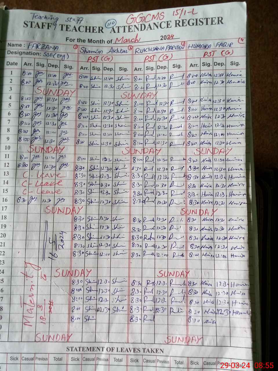 | No. of Students Present - Female | 0 | 0 | 45 | 30 | 29 | 26 | 27 | 40 | 197 | |||||||