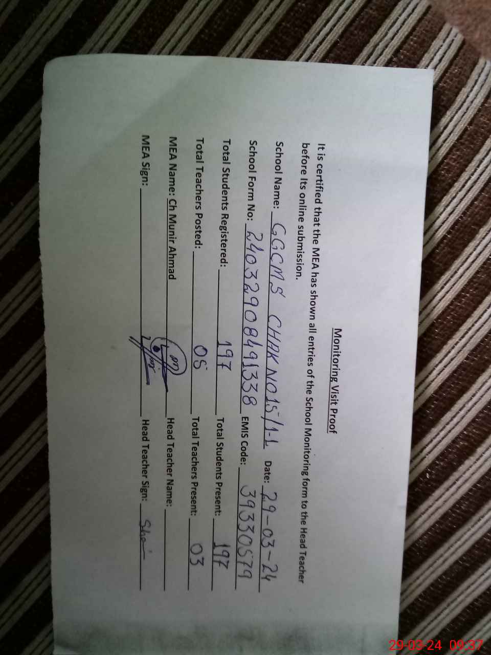 | Certified that this School was Inspected by the Undersigned MEA/DMO Today and the Information Stated Above is as Per Record. | |||||