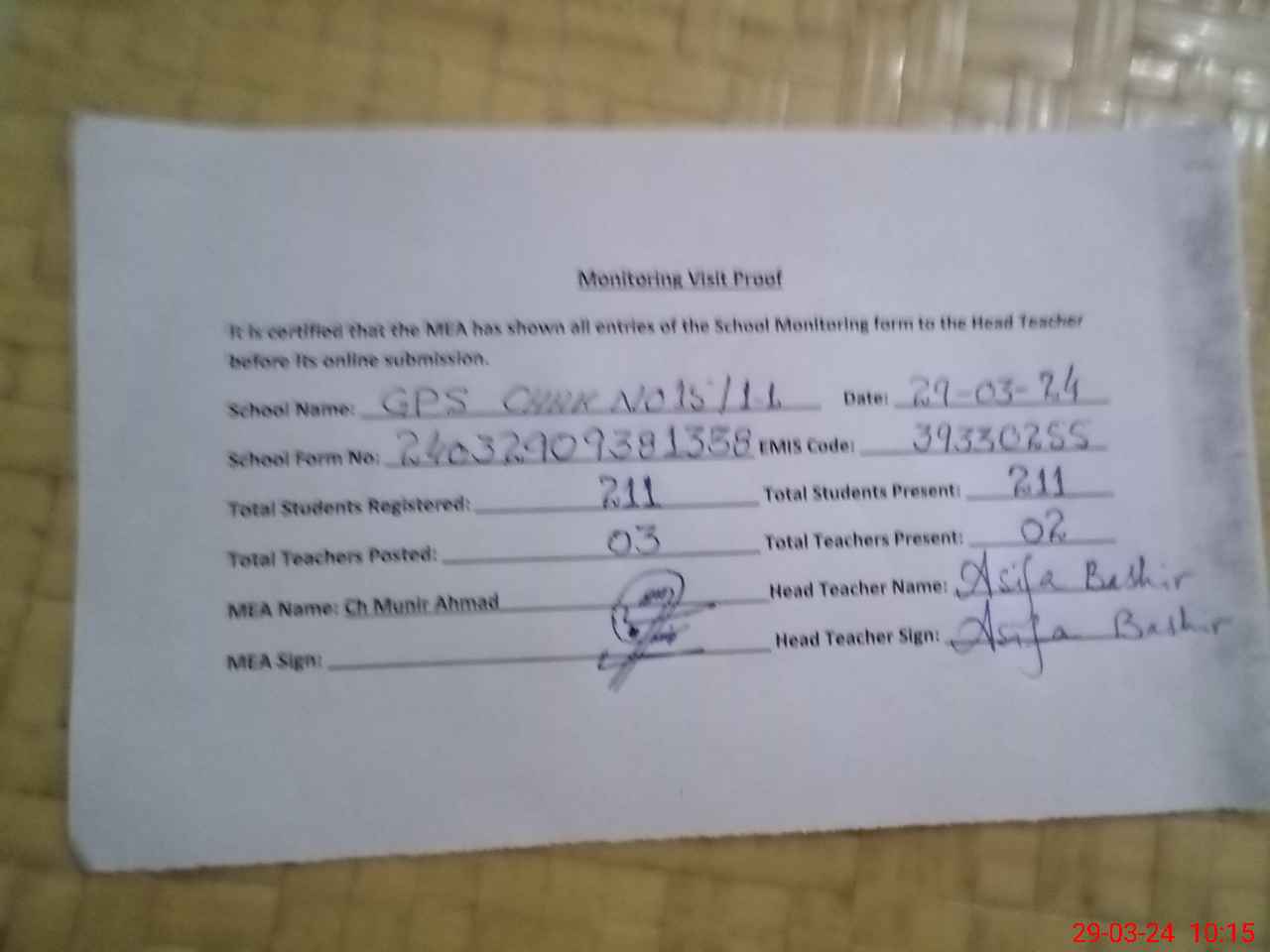 | Certified that this School was Inspected by the Undersigned MEA/DMO Today and the Information Stated Above is as Per Record. | |||||