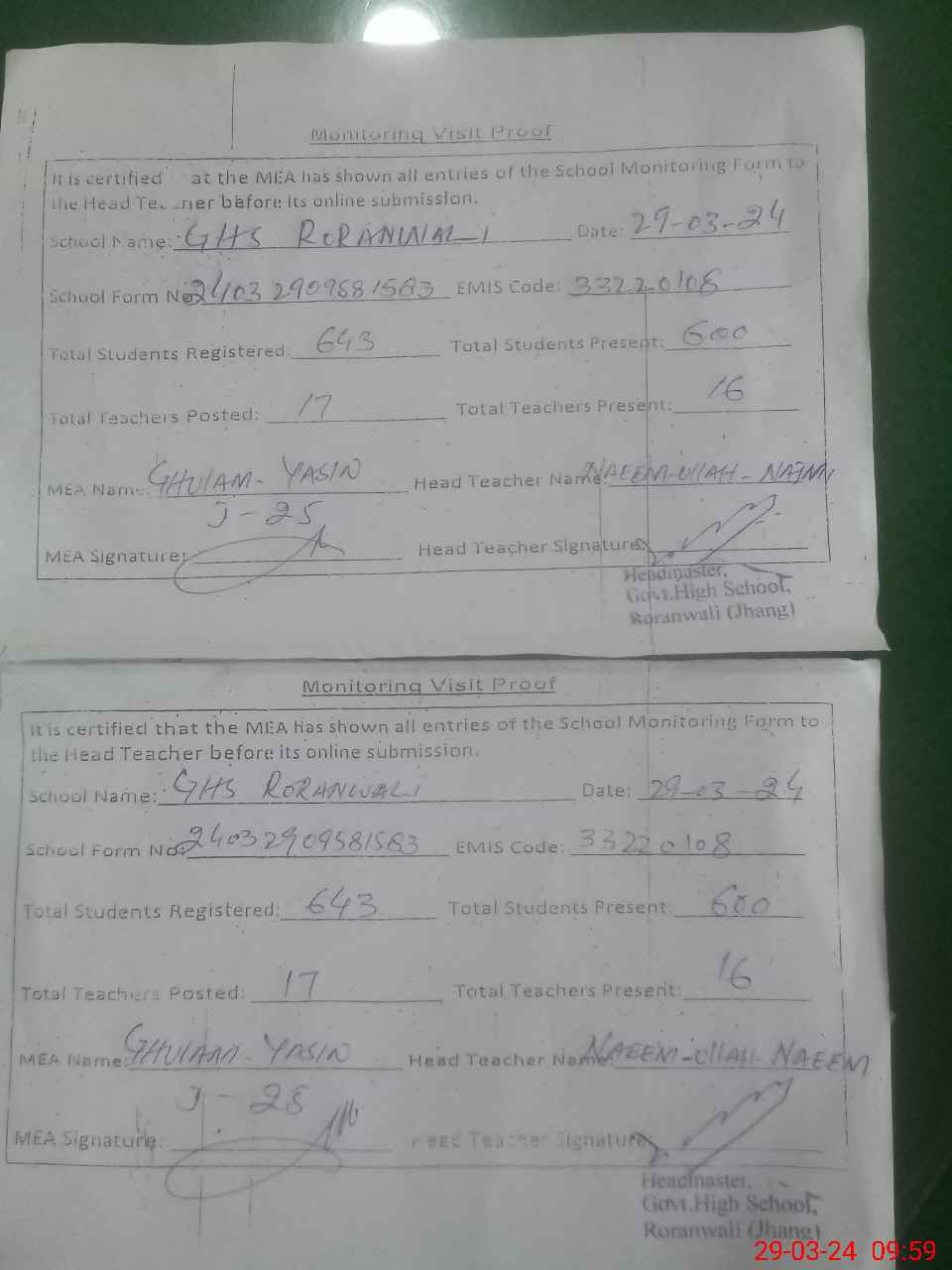 | Attendance Register | Head Teacher | MEA with School | Visit Proof |