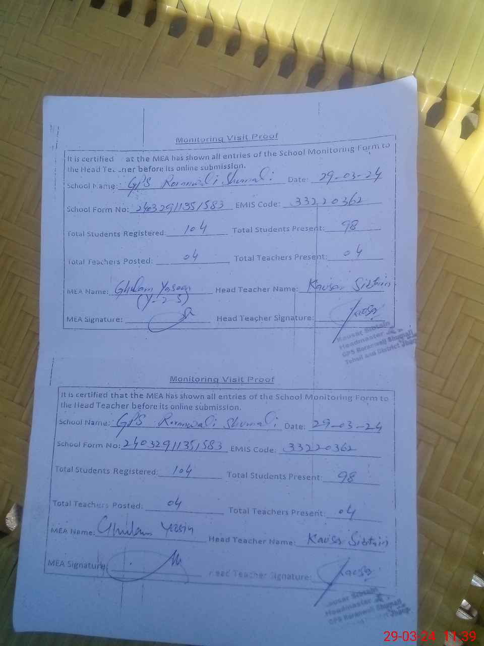 | Attendance Register | Head Teacher | MEA with School | Visit Proof |
