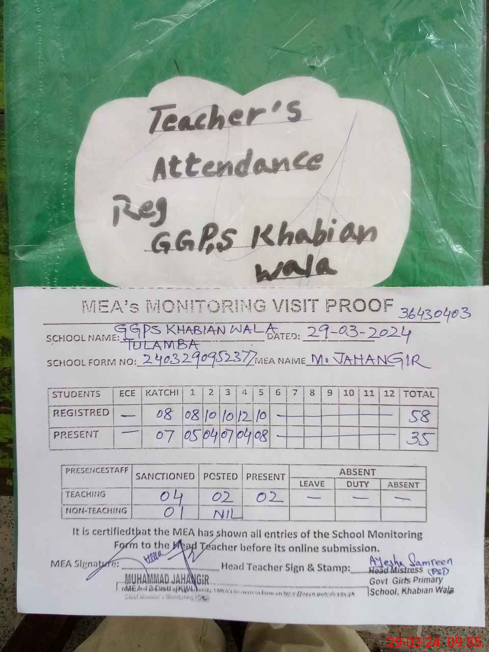 | Attendance Register | Head Teacher | MEA with School | Visit Proof |
