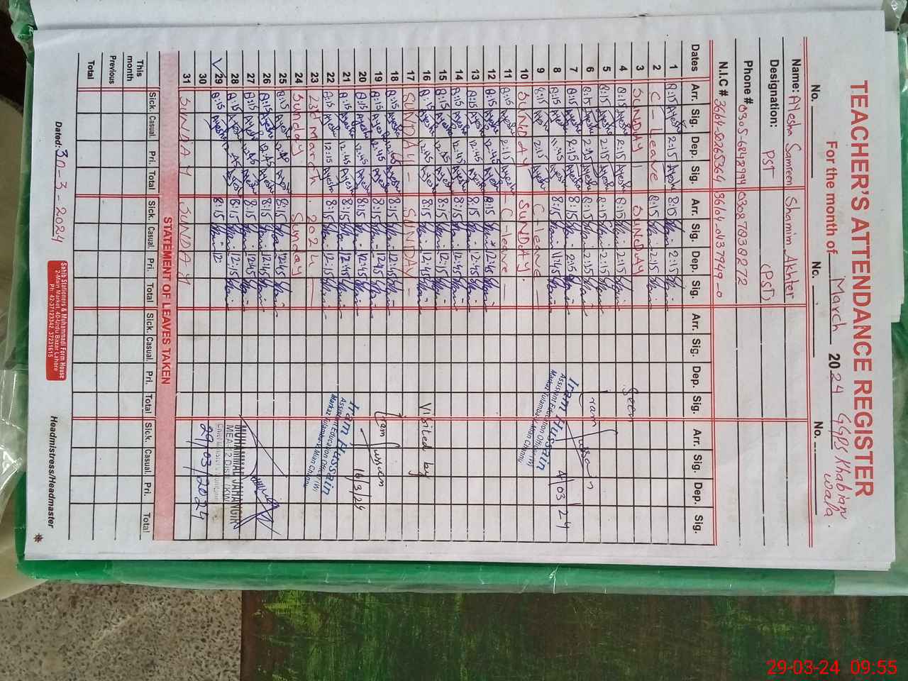 | Name: Ay**** Sa**** Designation: (School Headmaster's/Headmistress's) PST/PTC/JV Phone/Cell Number: 03**** |
