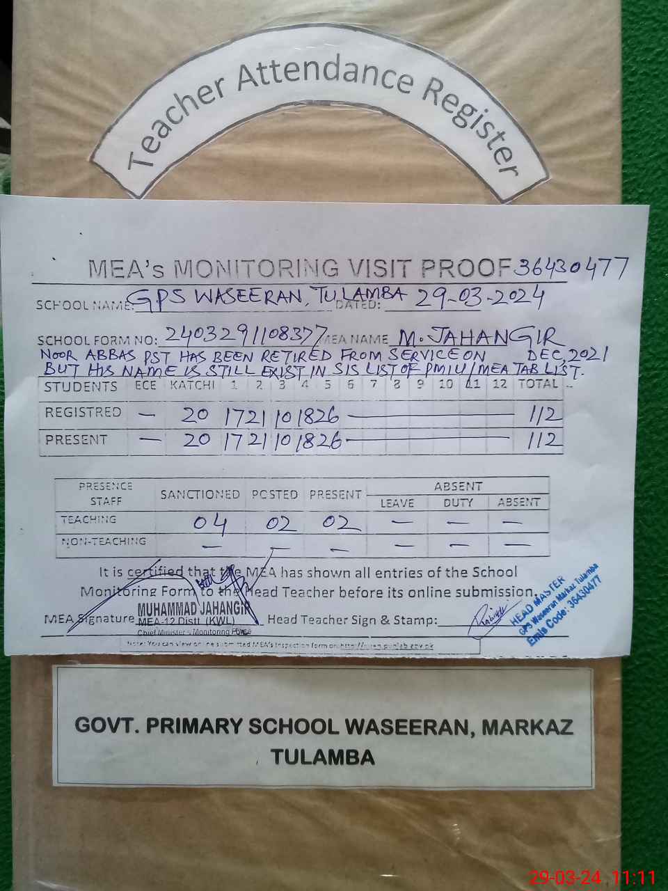 | EMIS Code: 36430477 | Name of School: GPS WASEERAN P/O TULAMBA | |||