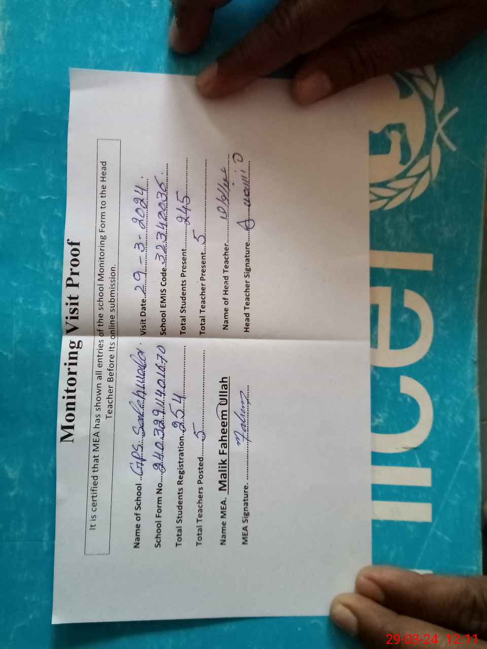 | Attendance Register | Head Teacher | MEA with School | Visit Proof |