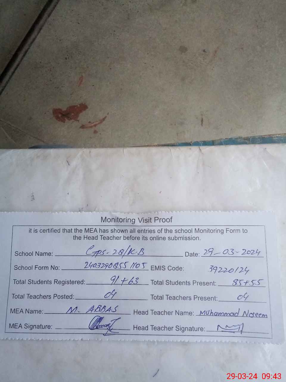 | Attendance Register | Head Teacher | MEA with School | Visit Proof |