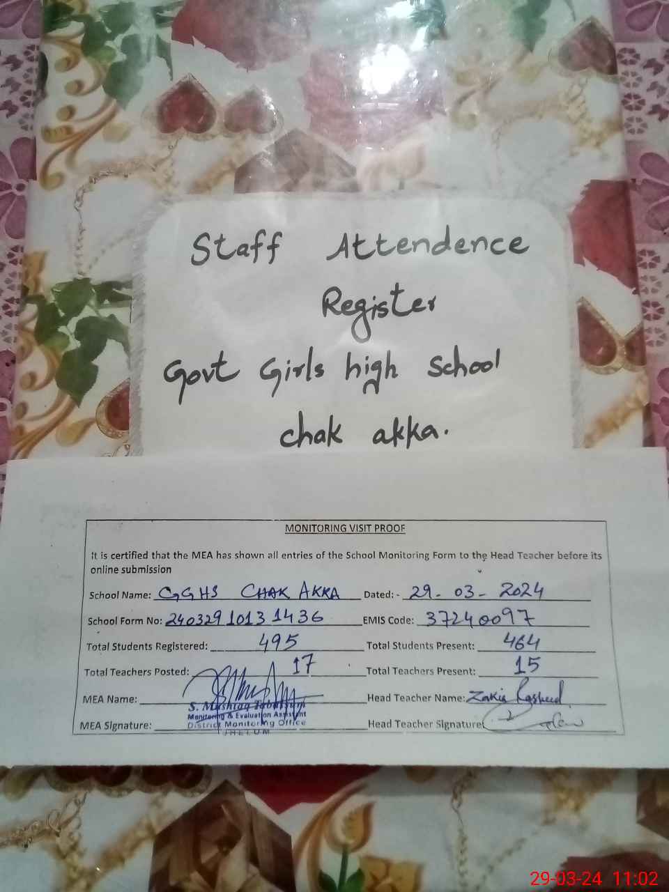 | Attendance Register | Head Teacher | MEA with School | Visit Proof |