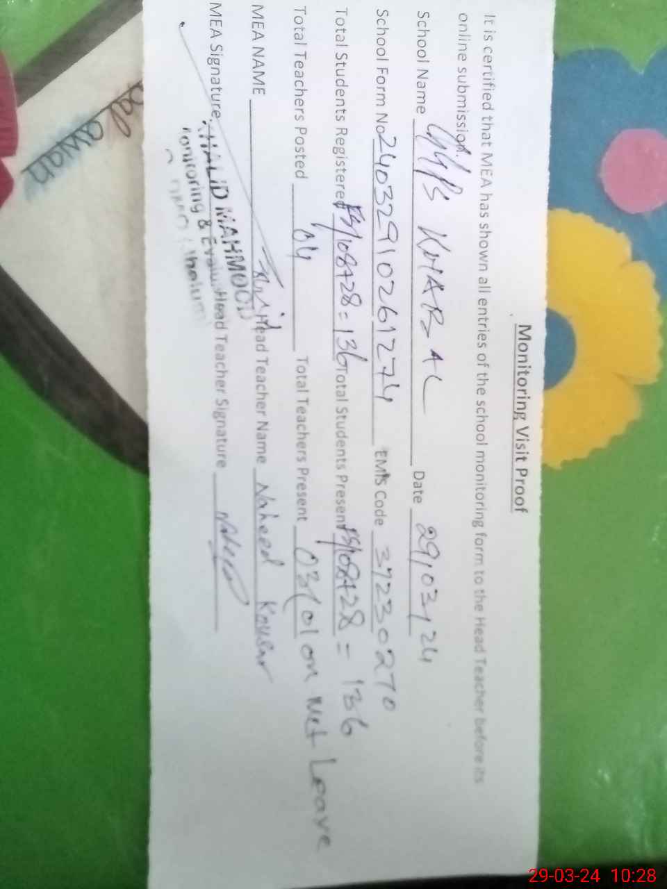 | Attendance Register | Head Teacher | MEA with School | Visit Proof |