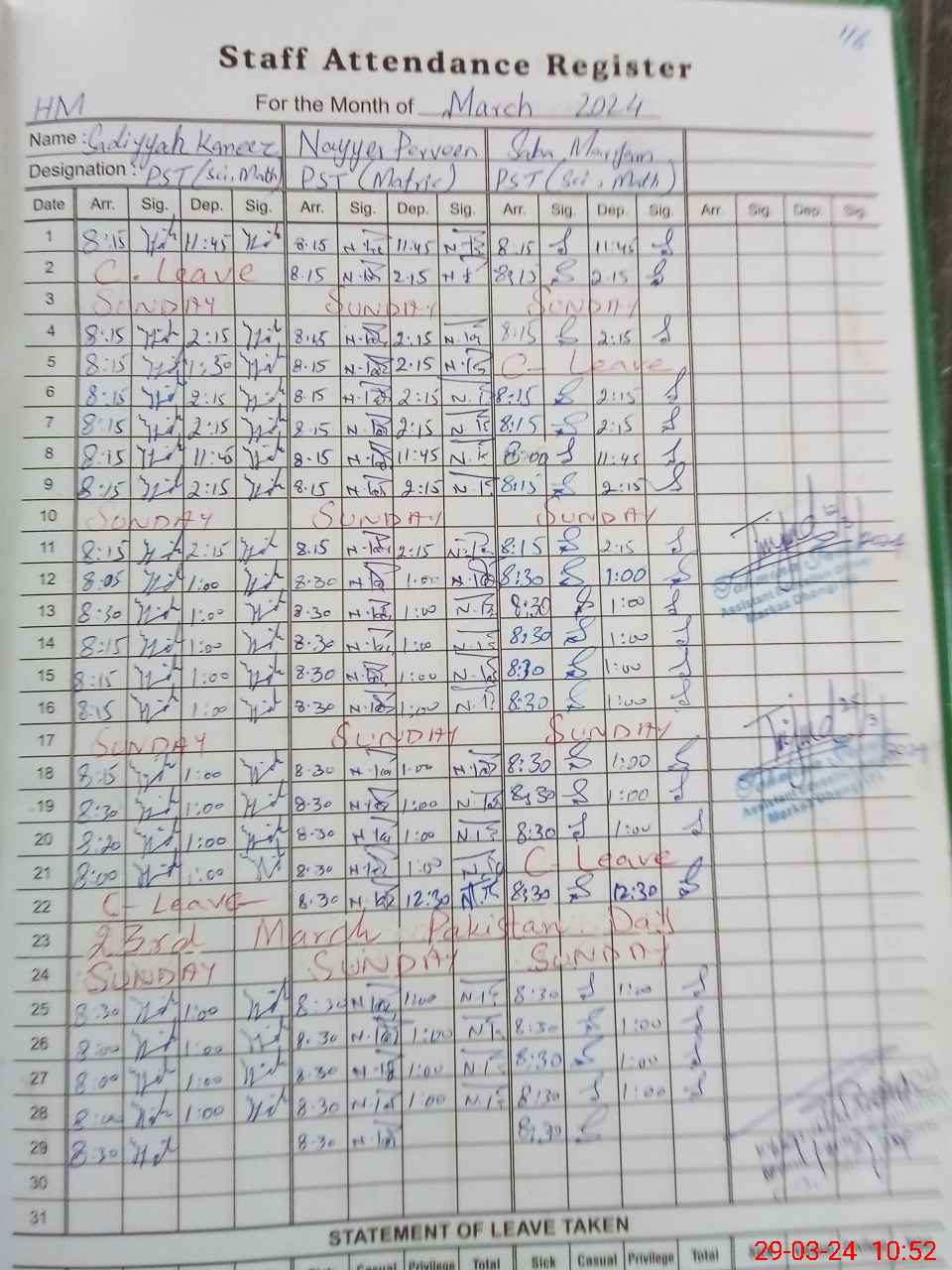 | CNIC | Full Name | Designation | R/C | Absence During Last Calender Month |
