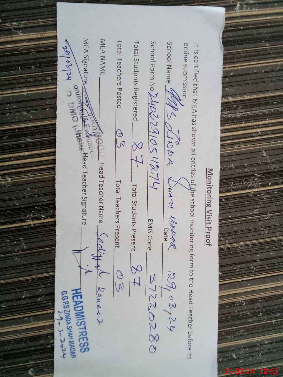 | EMIS Code: 37230280 | Name of School: GGPS ZINDA SHAH MADAR | |||