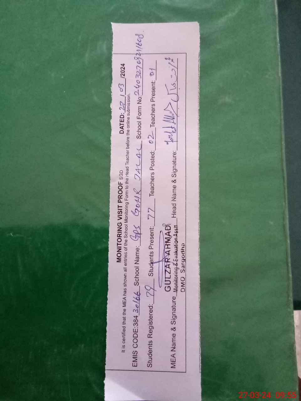 | Attendance Register | Head Teacher | MEA with School | Visit Proof |