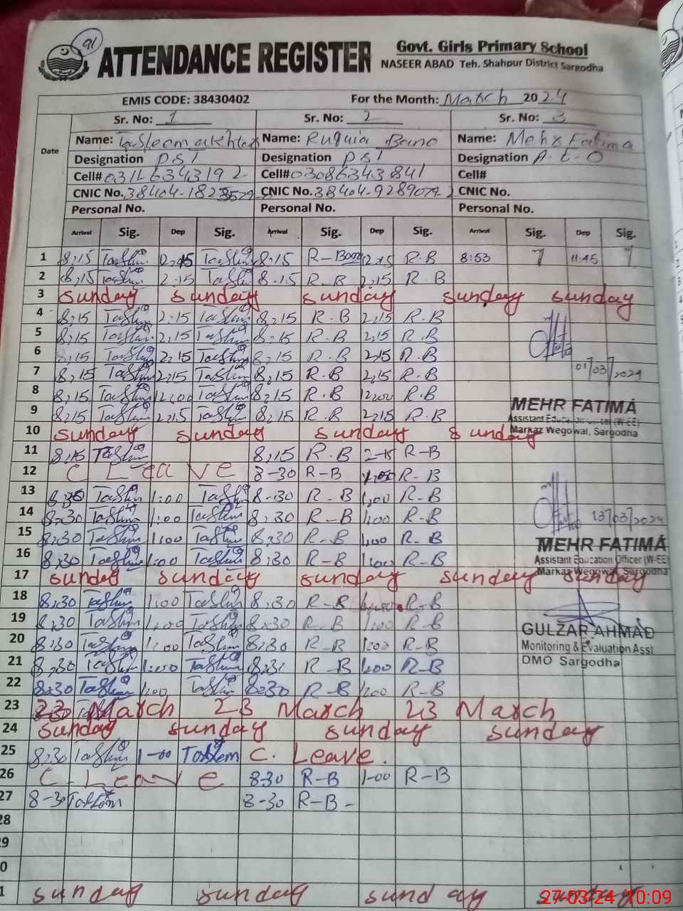 | CNIC | Full Name | Designation | R/C | Absence During Last Calender Month |
