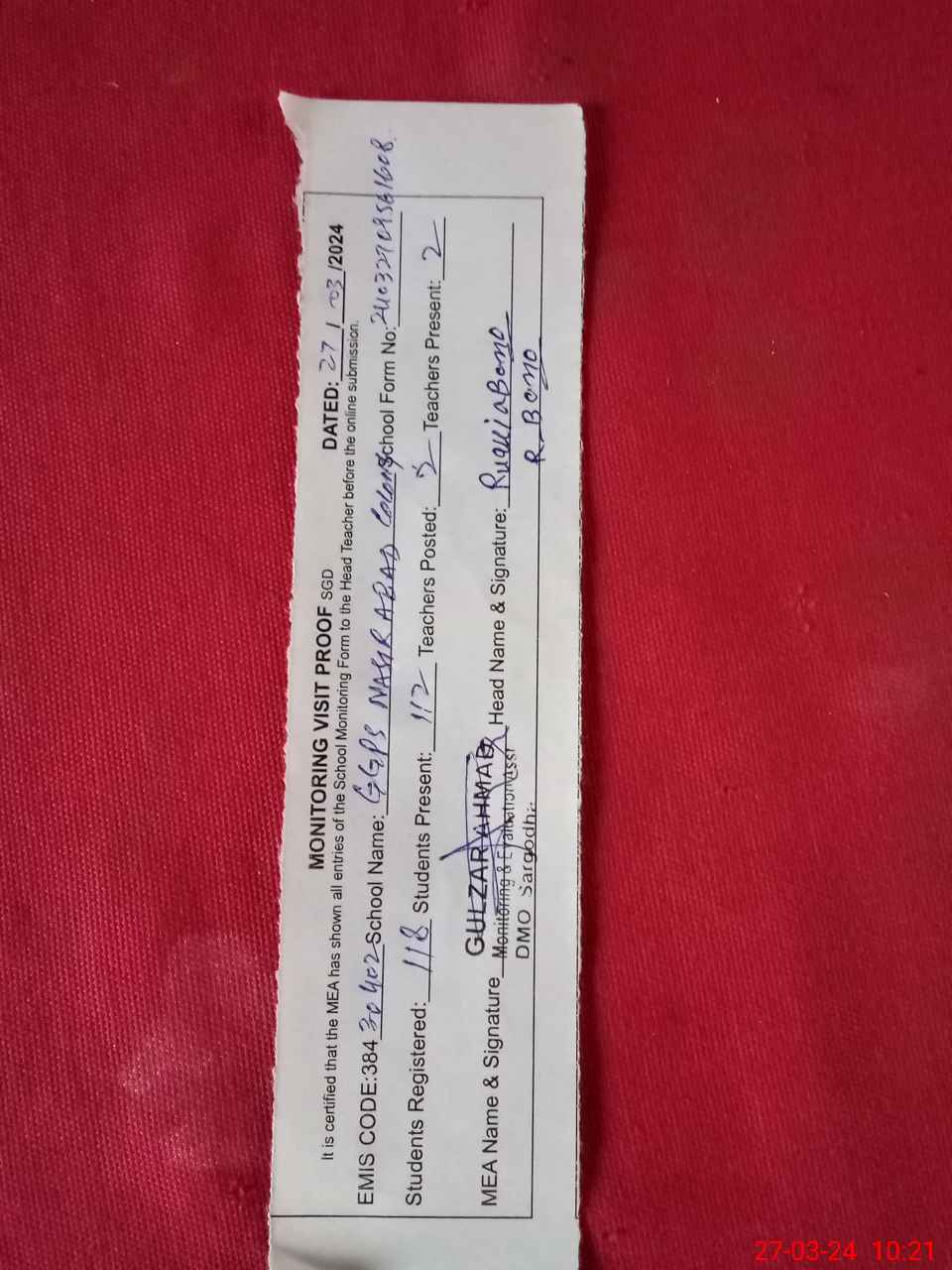 | Attendance Register | Head Teacher | MEA with School | Visit Proof |