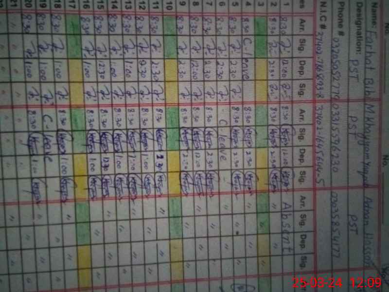 | CNIC | Full Name | Designation | R/C | Absence During Last Calender Month |