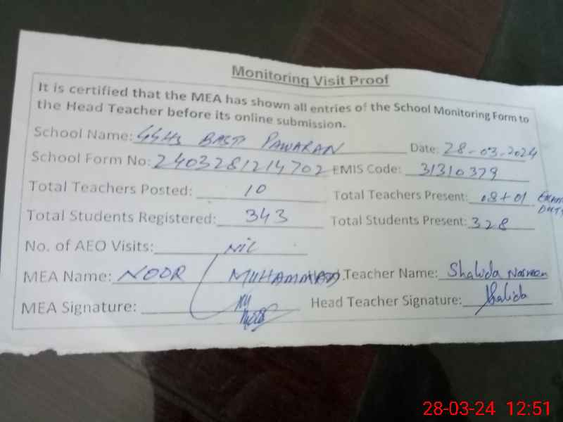 | Certified that this School was Inspected by the Undersigned MEA/DMO Today and the Information Stated Above is as Per Record. | |||||