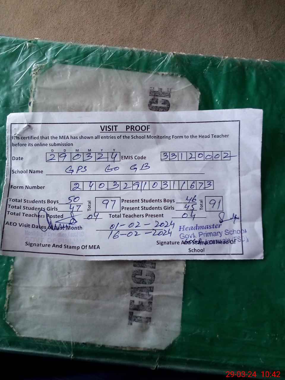 | Attendance Register | Head Teacher | MEA with School | Visit Proof |