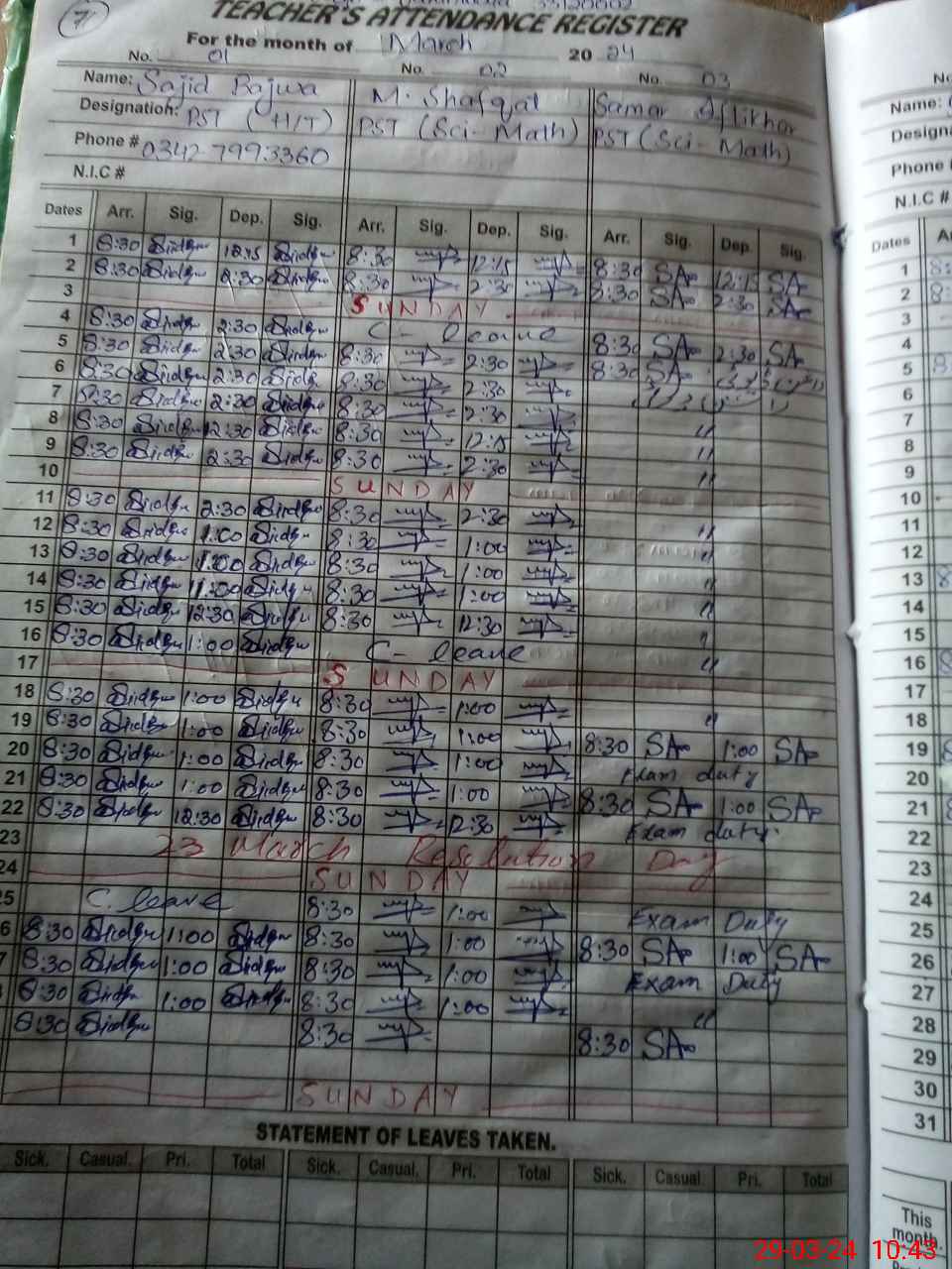 | Name: SA**** RA**** BA**** Designation: (School Headmaster's/Headmistress's) PST Phone/Cell Number: 03**** |