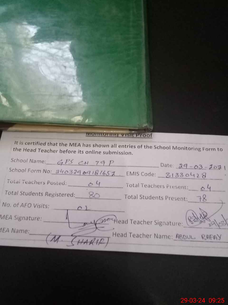 | Attendance Register | Head Teacher | MEA with School | Visit Proof |