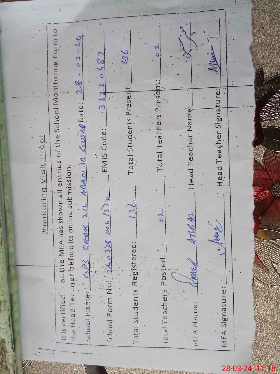 | Attendance Register | Head Teacher | MEA with School | Visit Proof |