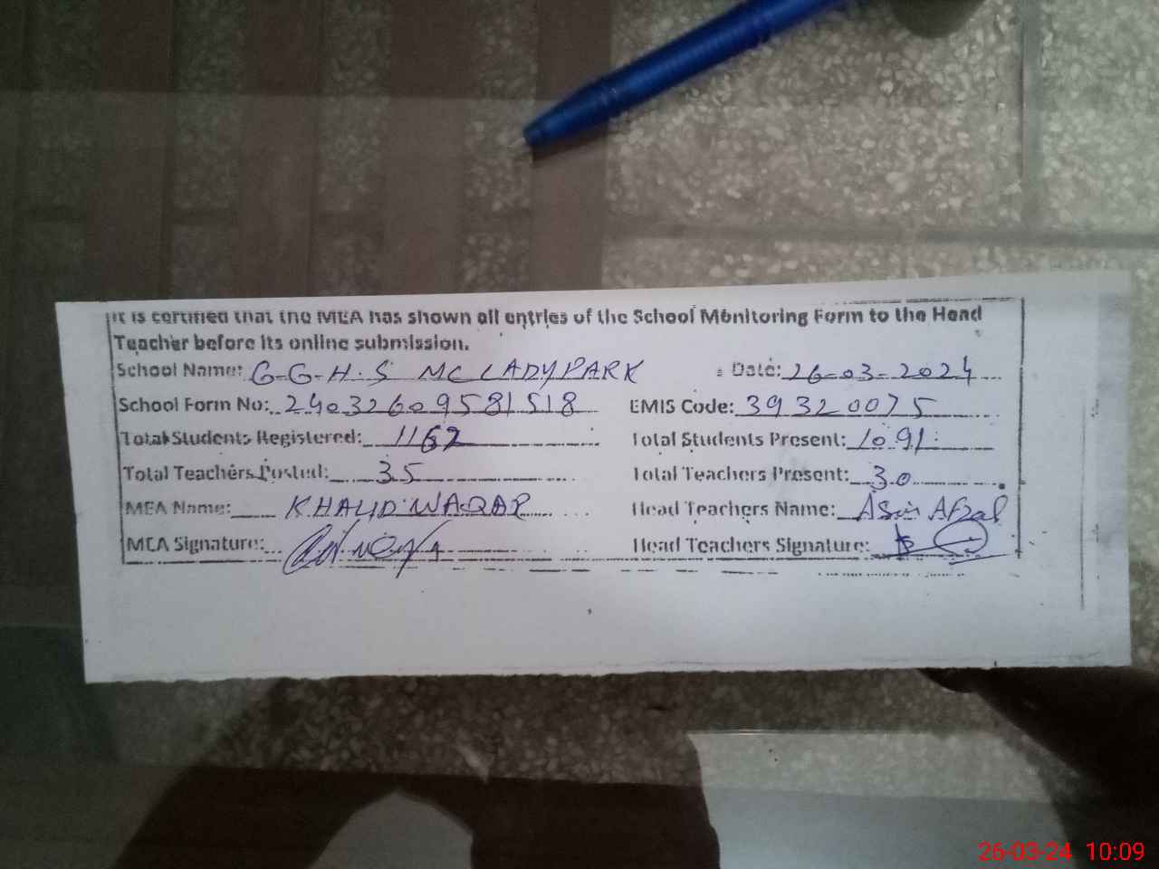 | EMIS Code: 39320075 | Name of School: GGHS MC LADY PARK OKARA | |||