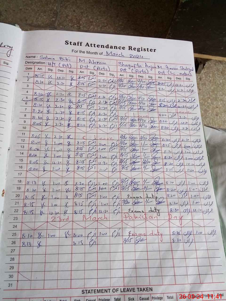 | Leave | Duty | Absent | Maternity | Medical | Ex- Pak |