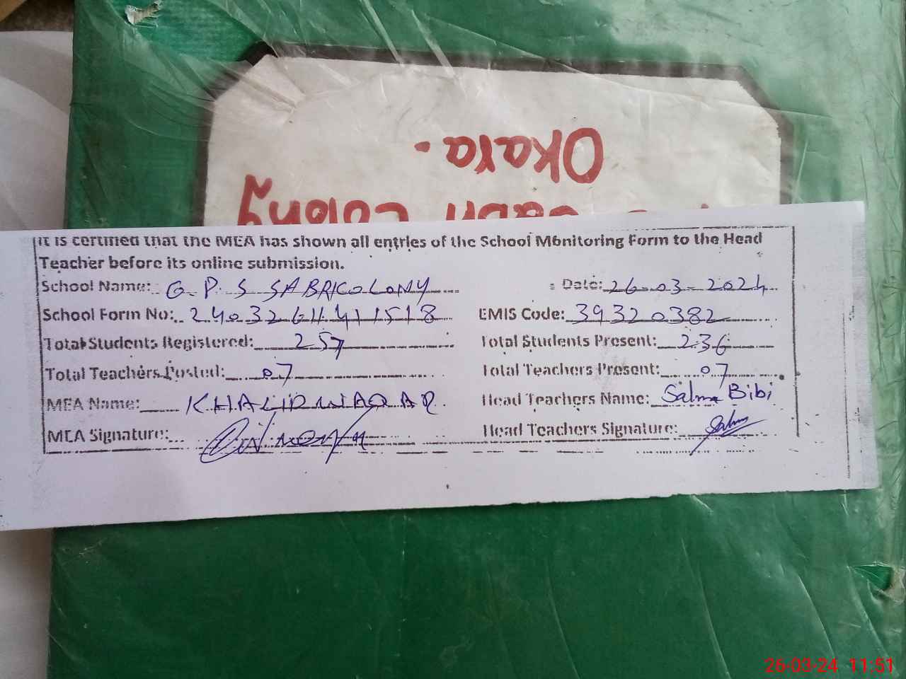 | Certified that this School was Inspected by the Undersigned MEA/DMO Today and the Information Stated Above is as Per Record. | |||||