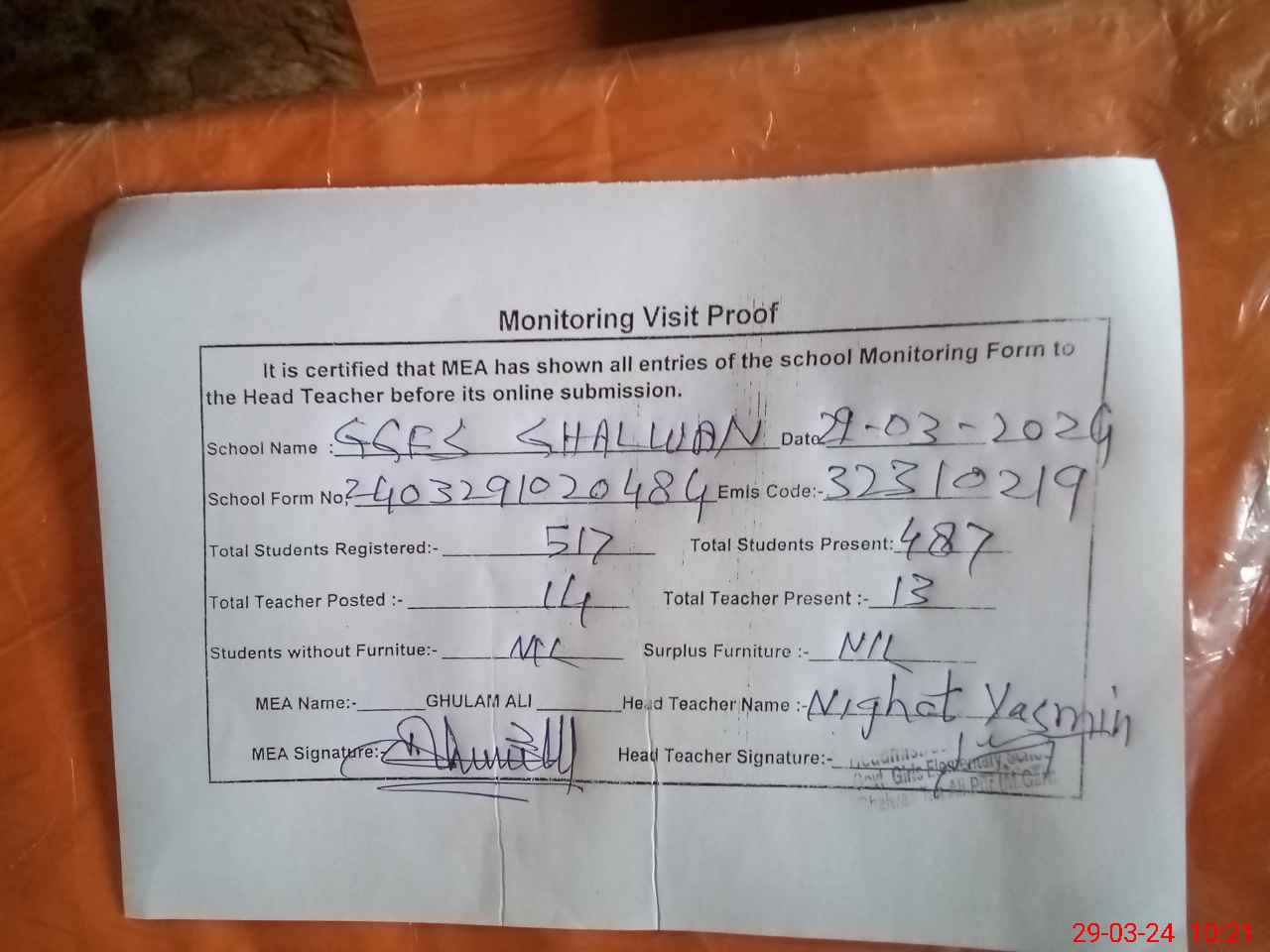 | Attendance Register | Head Teacher | MEA with School | Visit Proof |