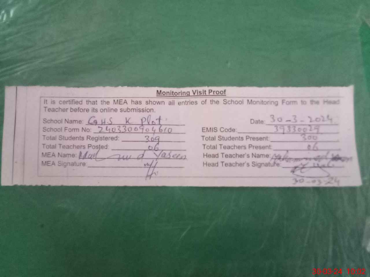 | EMIS Code: 39330029 | Name of School: GHS K PLOT | |||