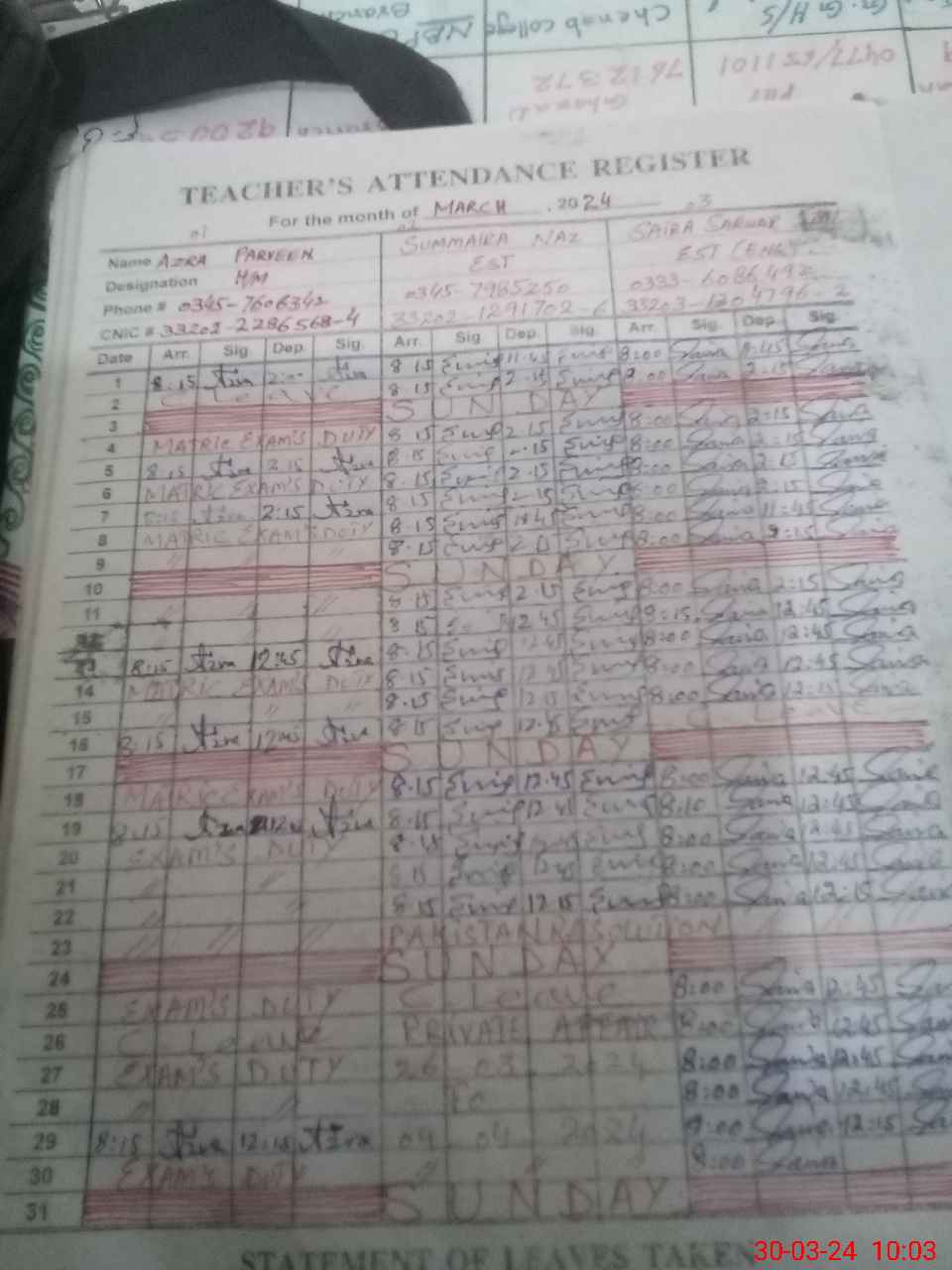 | 33**** | Su**** Ba**** | PST | Regular | 0 | 0 | 0 | 0 | 0 | 0 | 0 | 0 | 0 | Exam Duty |