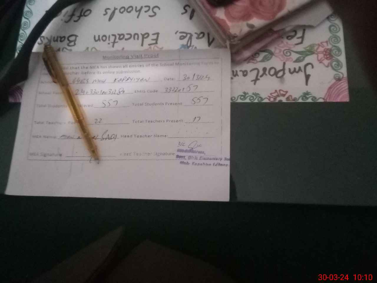 | Name: Az**** pe**** Designation: (School Headmaster's/Headmistress's) sse Phone/Cell Number: 03**** |
