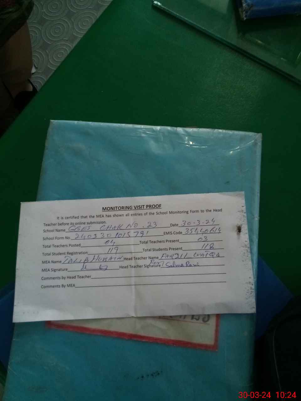 | Attendance Register | Head Teacher | MEA with School | Visit Proof |