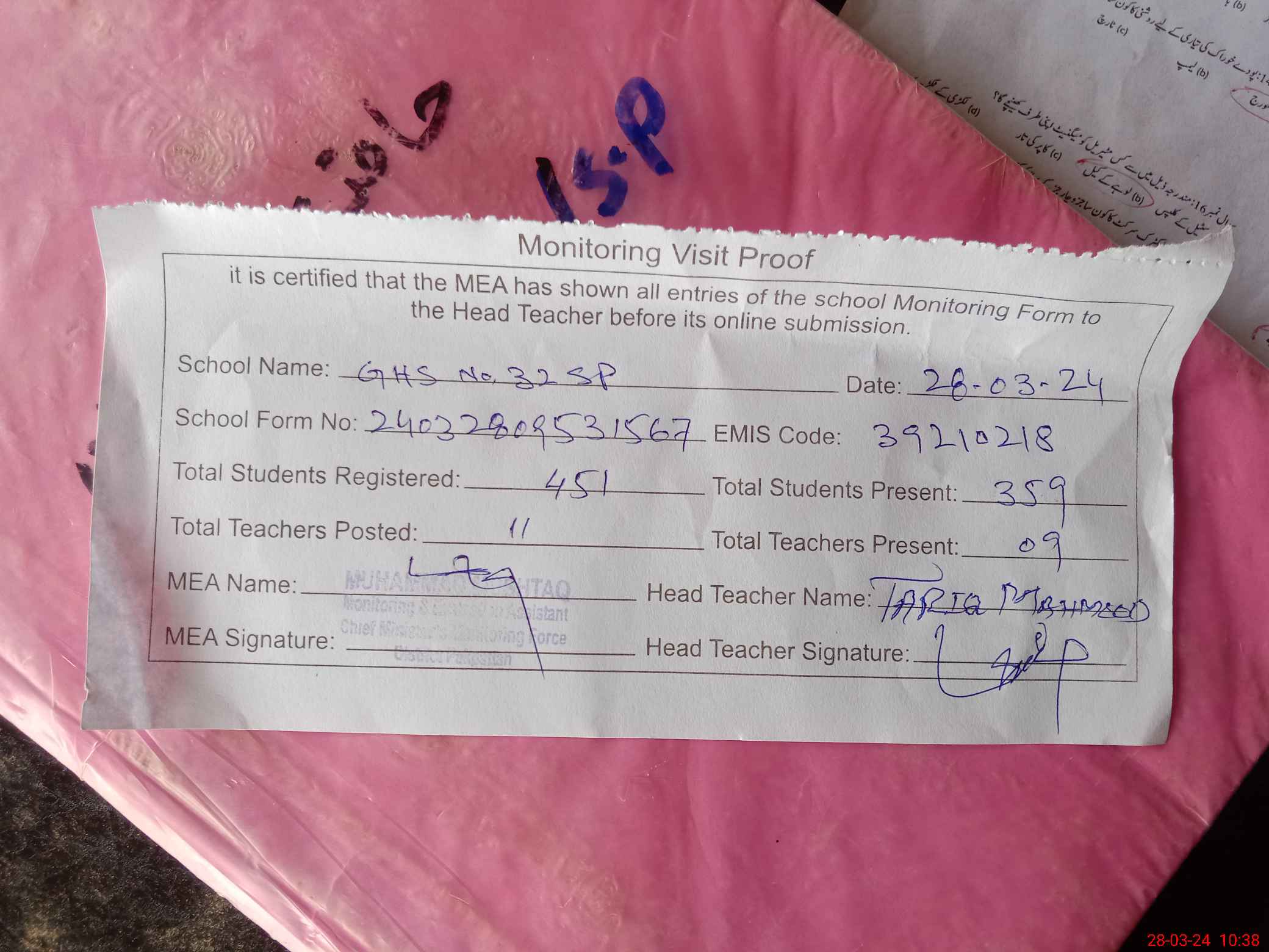 | Certified that this School was Inspected by the Undersigned MEA/DMO Today and the Information Stated Above is as Per Record. | |||||