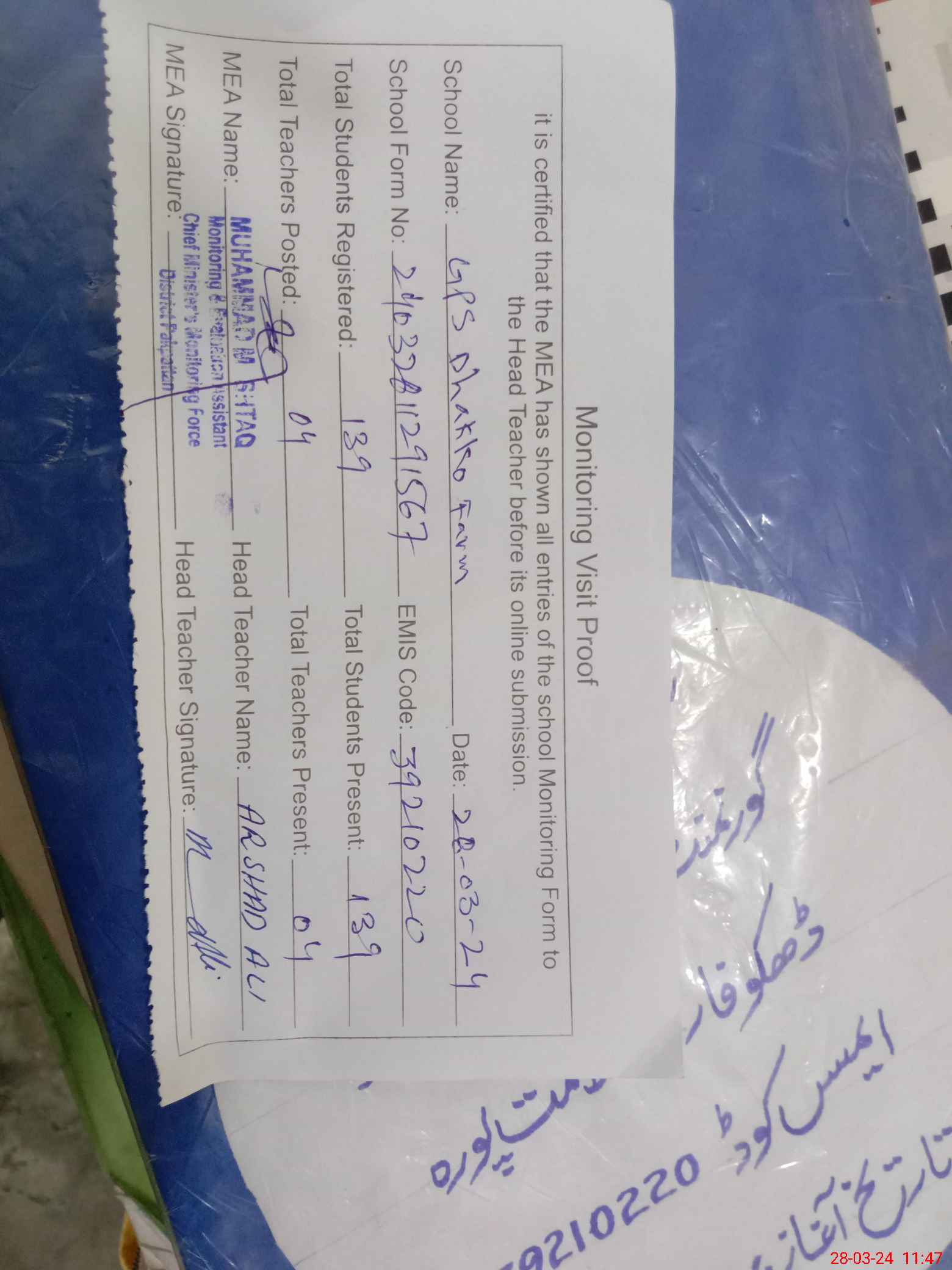 | Attendance Register | Head Teacher | MEA with School | Visit Proof |