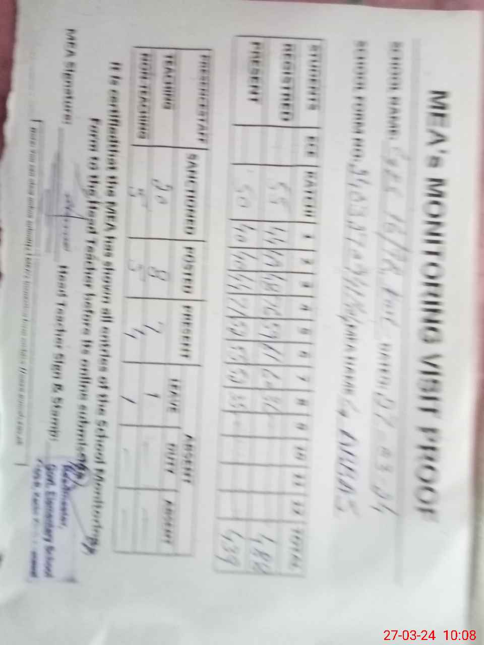 | Attendance Register | Head Teacher | MEA with School | Visit Proof |