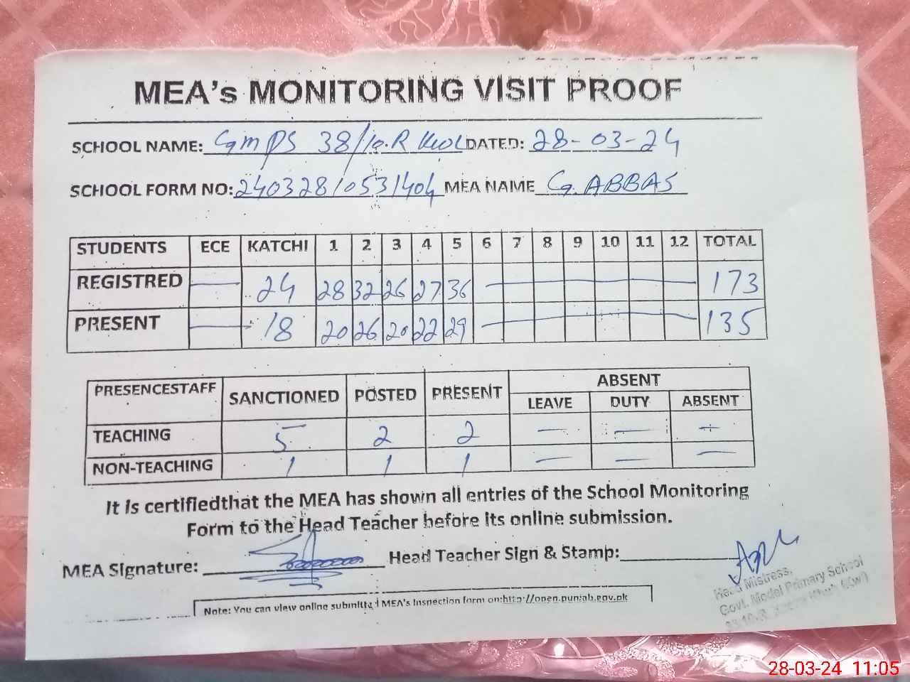 | Attendance Register | Head Teacher | MEA with School | Visit Proof |