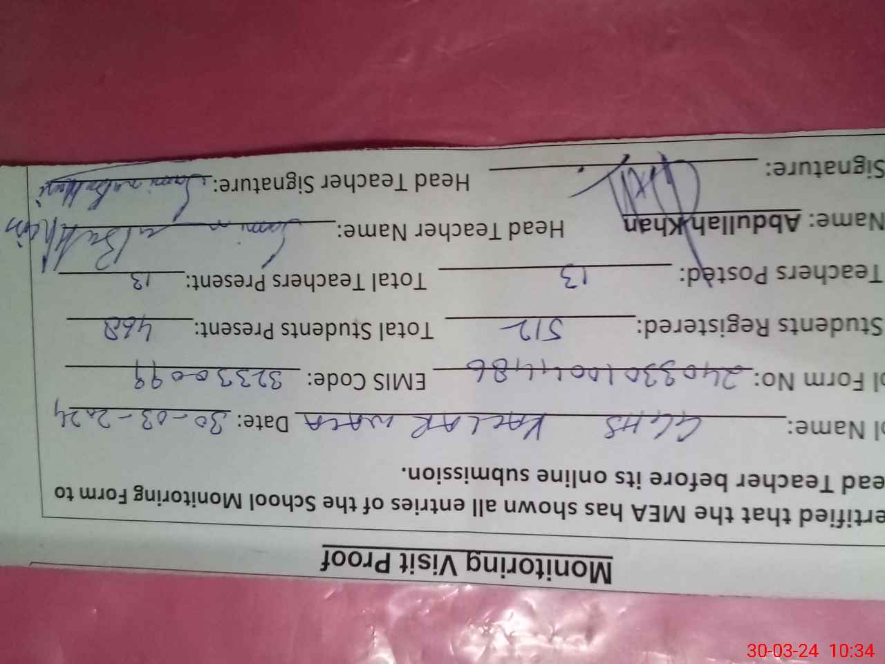 | Certified that this School was Inspected by the Undersigned MEA/DMO Today and the Information Stated Above is as Per Record. | |||||