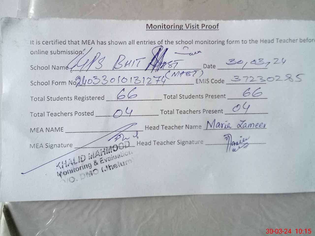 | Attendance Register | Head Teacher | MEA with School | Visit Proof |