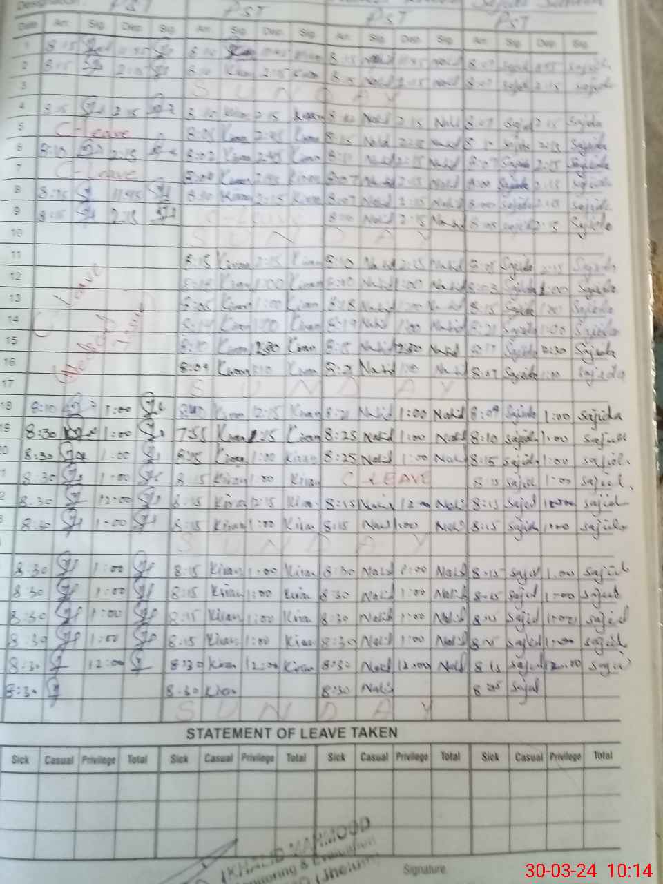 | CNIC | Full Name | Designation | R/C | Absence During Last Calender Month |