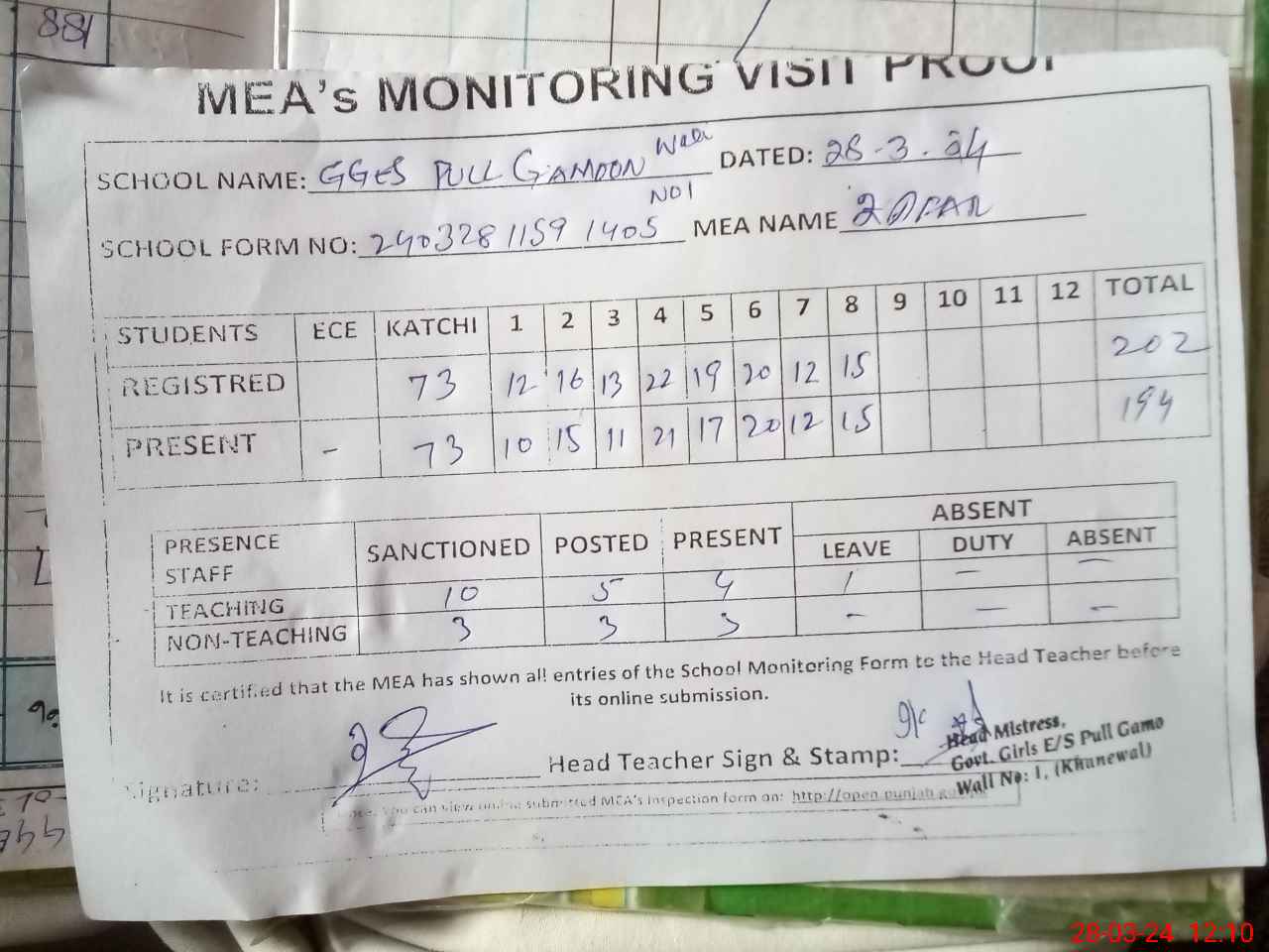 | Attendance Register | Head Teacher | MEA with School | Visit Proof |