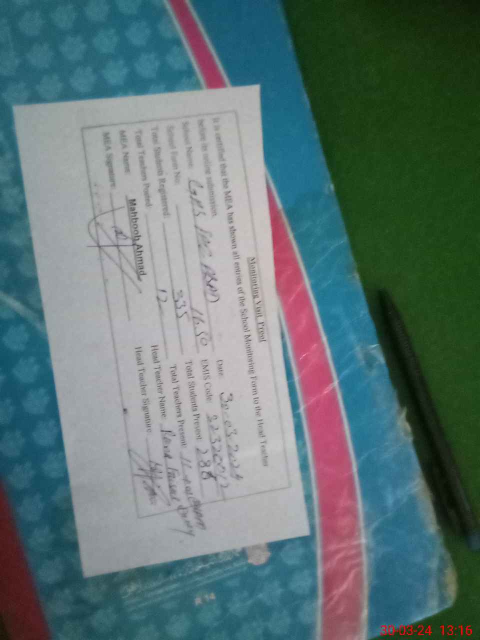 | Attendance Register | Head Teacher | MEA with School | Visit Proof |