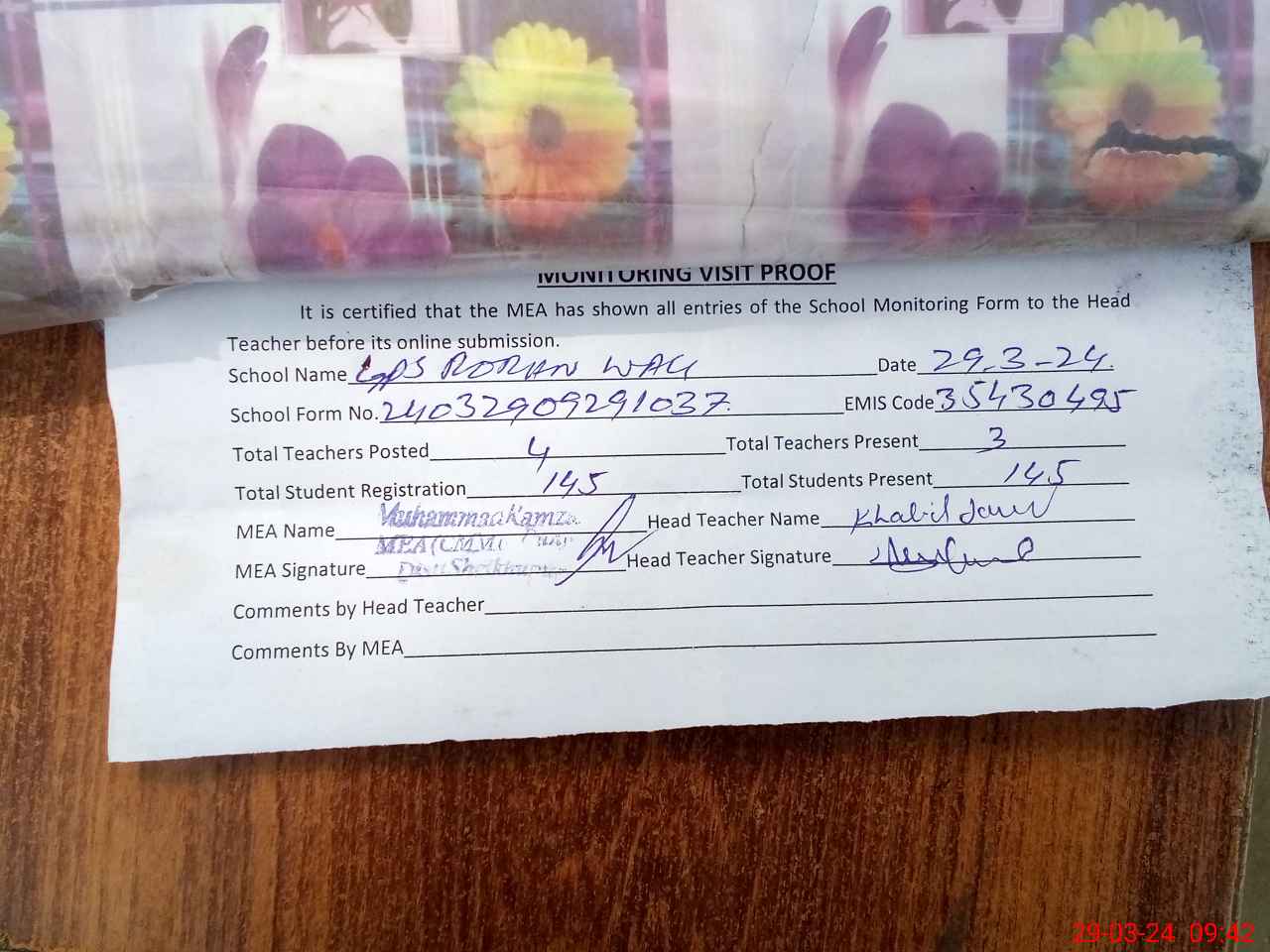 | Attendance Register | Head Teacher | MEA with School | Visit Proof |