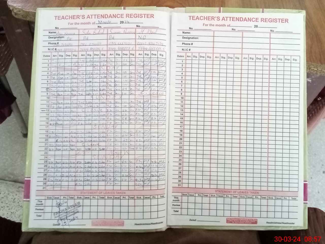 | CNIC | Full Name | Designation | R/C | Absence During Last Calender Month |