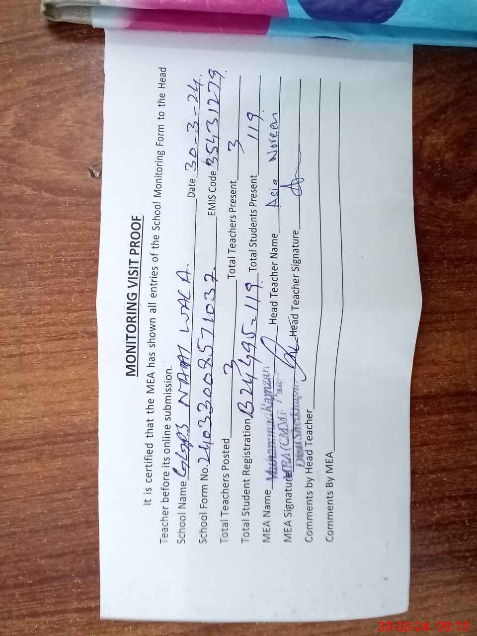 | Attendance Register | Head Teacher | MEA with School | Visit Proof |