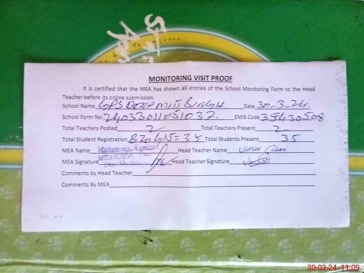 | Attendance Register | Head Teacher | MEA with School | Visit Proof |