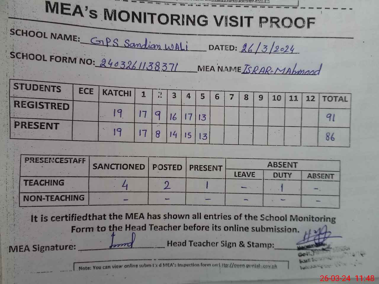| Attendance Register | Head Teacher | MEA with School | Visit Proof |