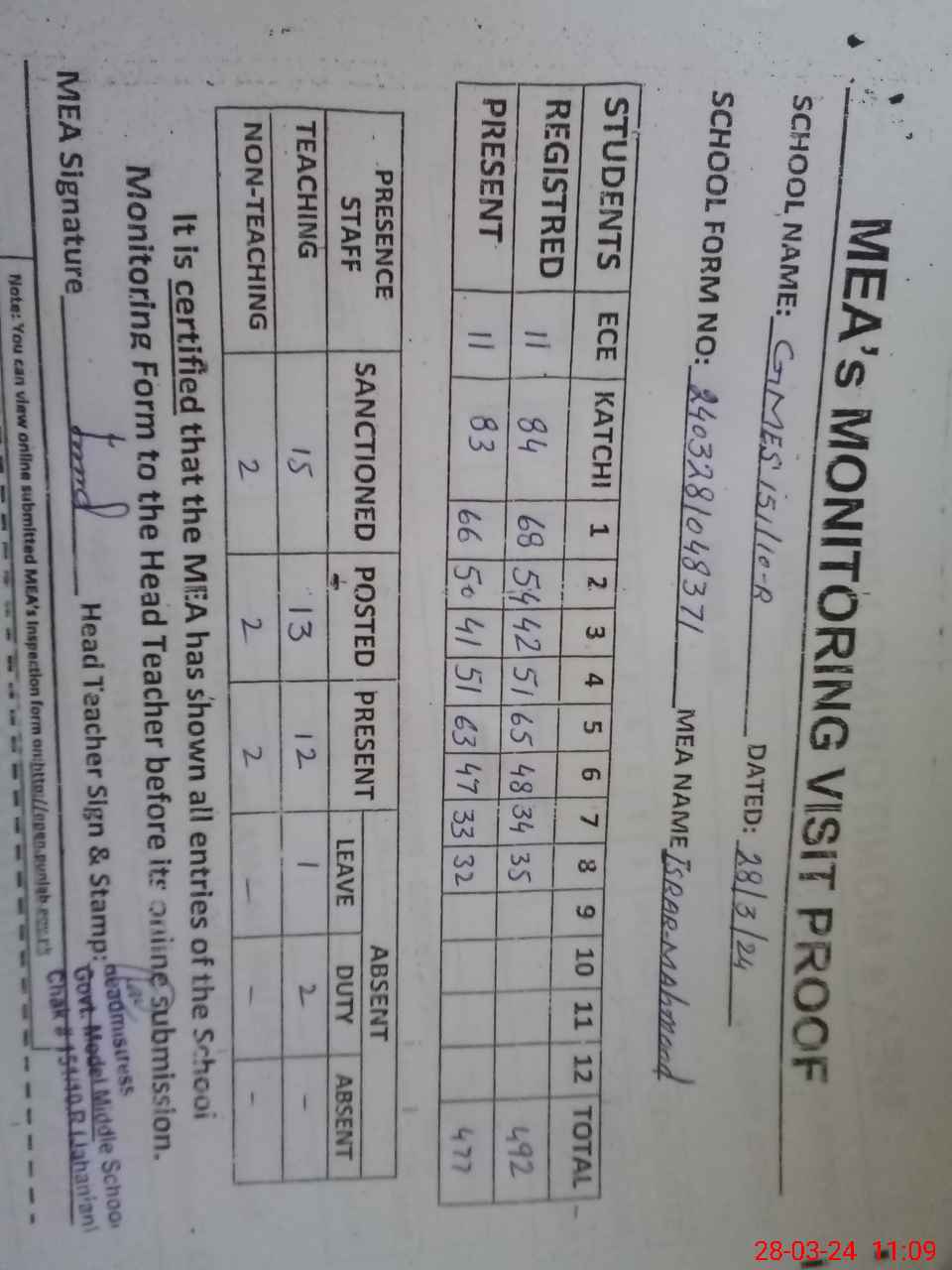 | Attendance Register | Head Teacher | MEA with School | Visit Proof |