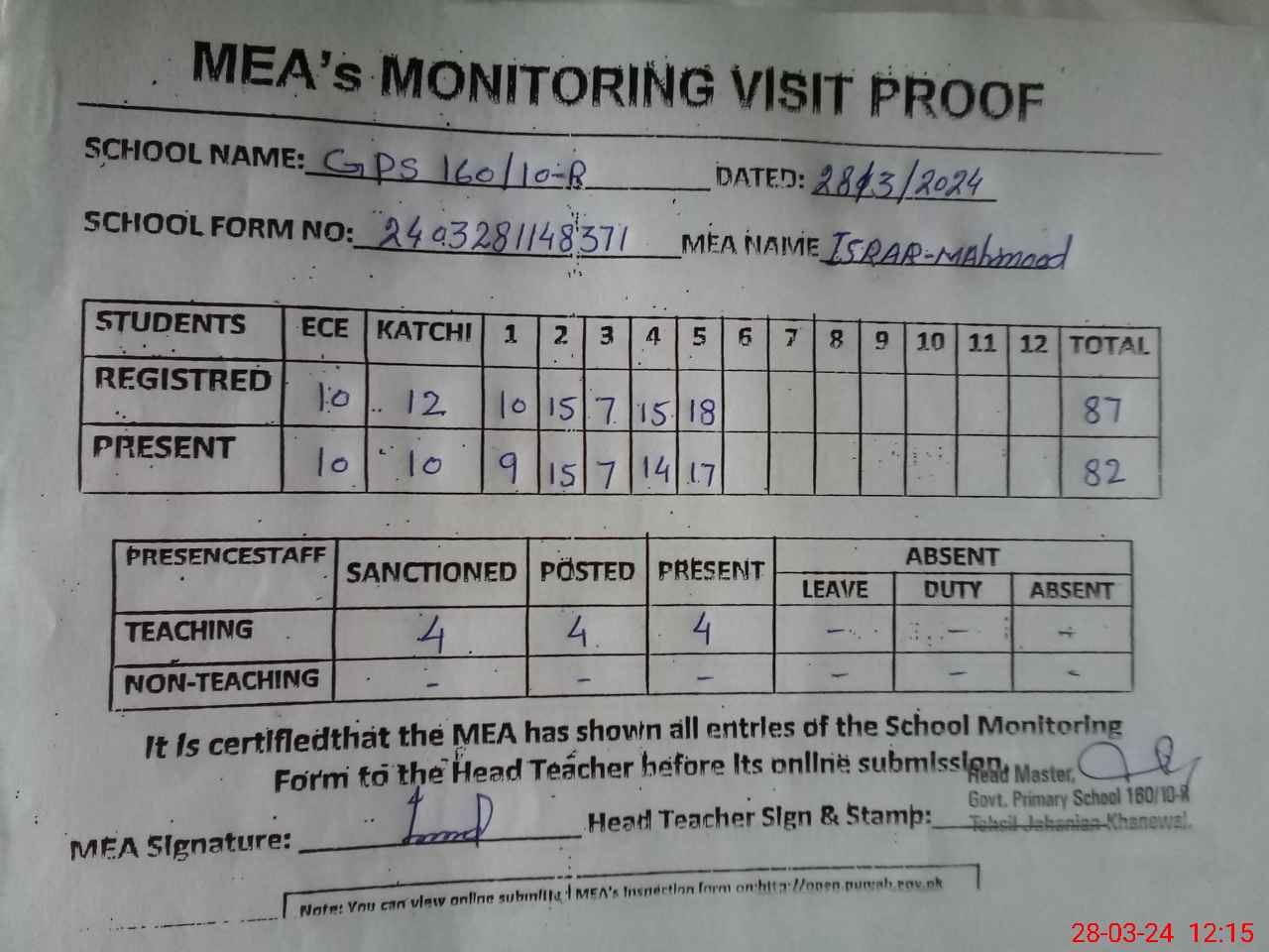 | Attendance Register | Head Teacher | MEA with School | Visit Proof |