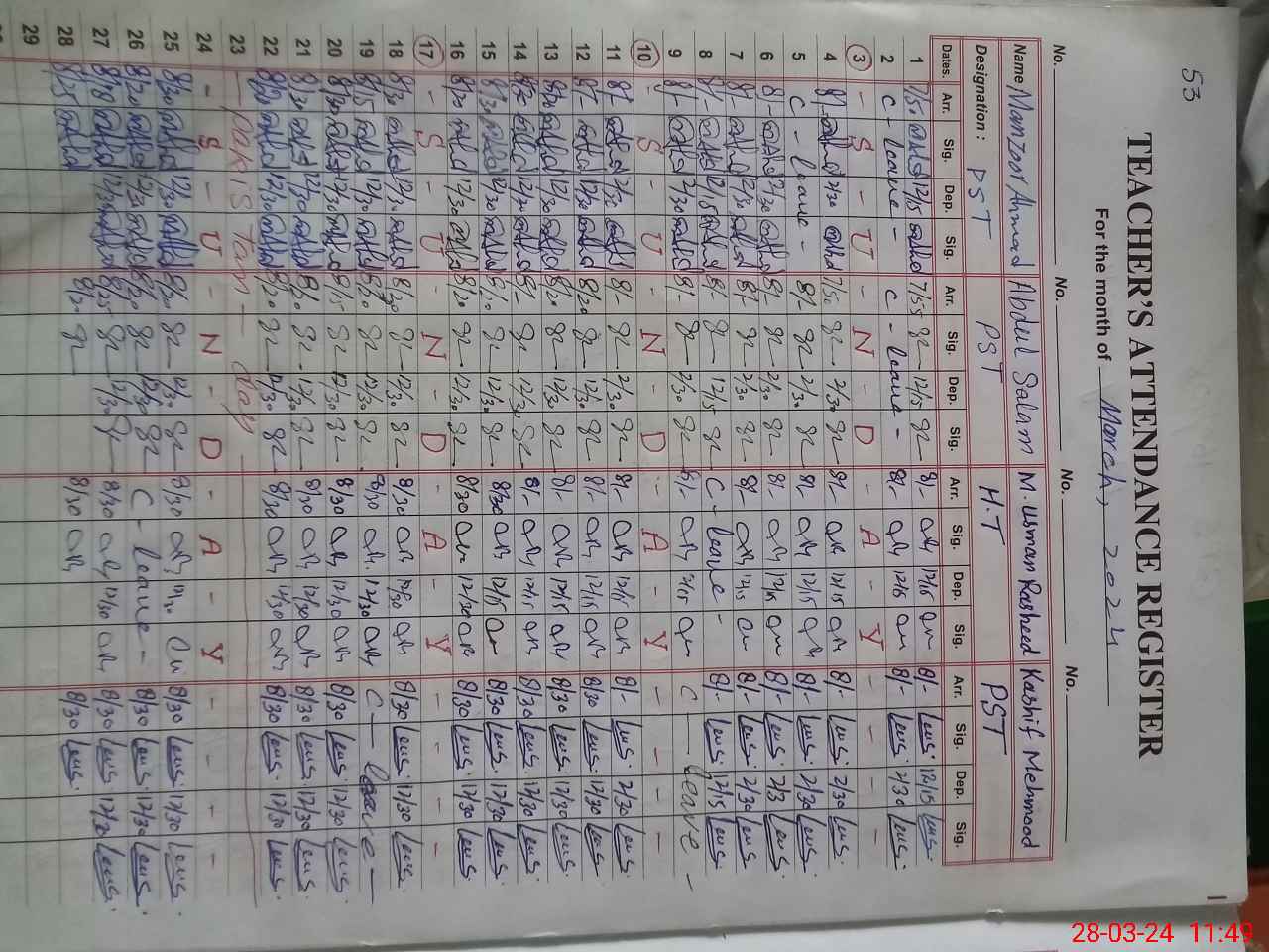 | CNIC | Full Name | Designation | R/C | Absence During Last Calender Month |